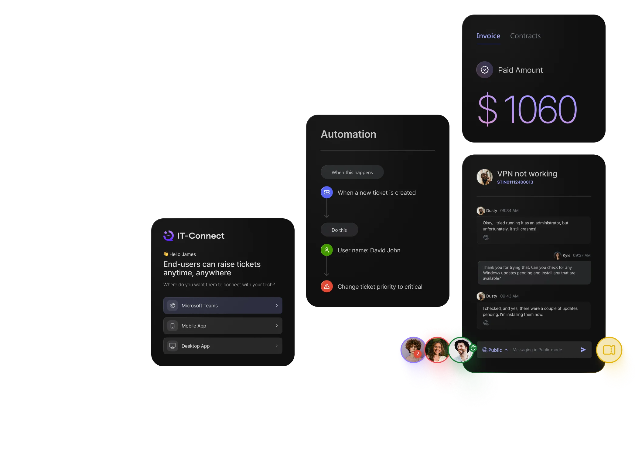 Give techs flexible ticket management across desktop and mobile. End-users can seek support via Teams, mobile, web, email, or desktop.