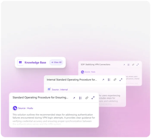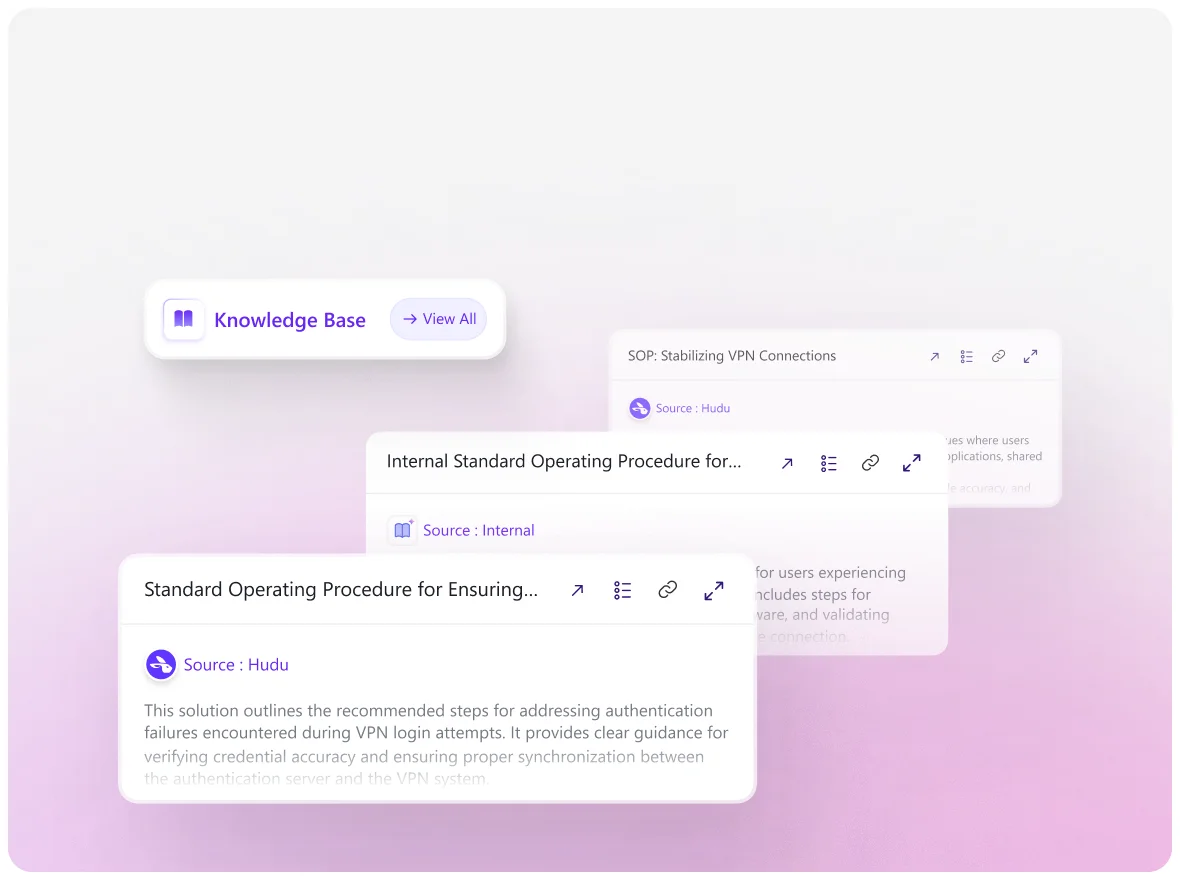 Instantly surfaces relevant knowledge base articles from documentation tools and internal knowledge base directly within tickets.