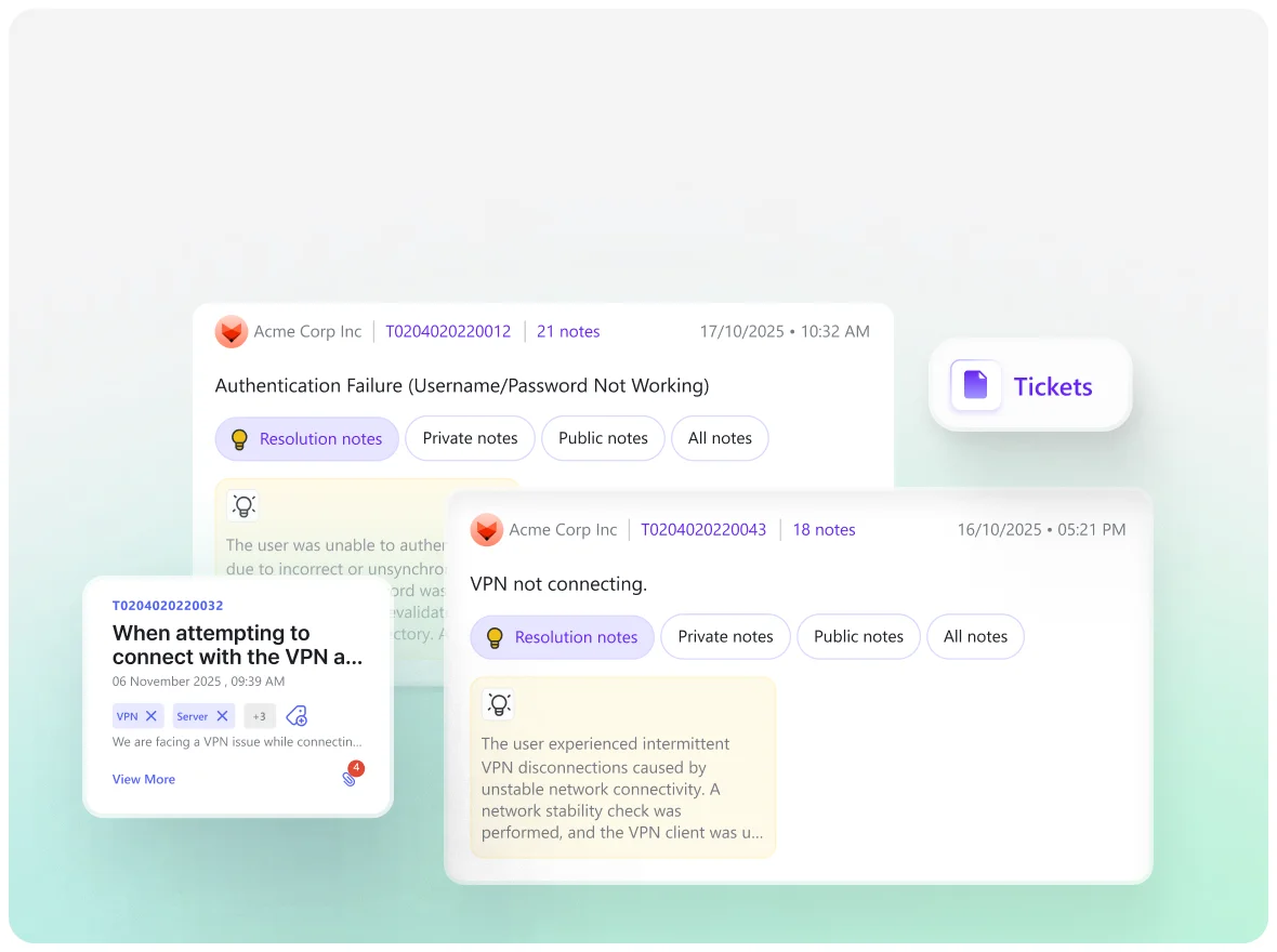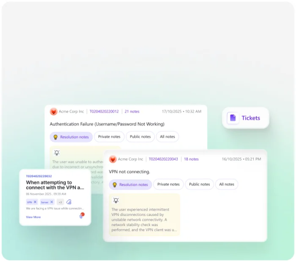 Retrieves similar past tickets and solutions, transforming experience into repeatable intelligence.