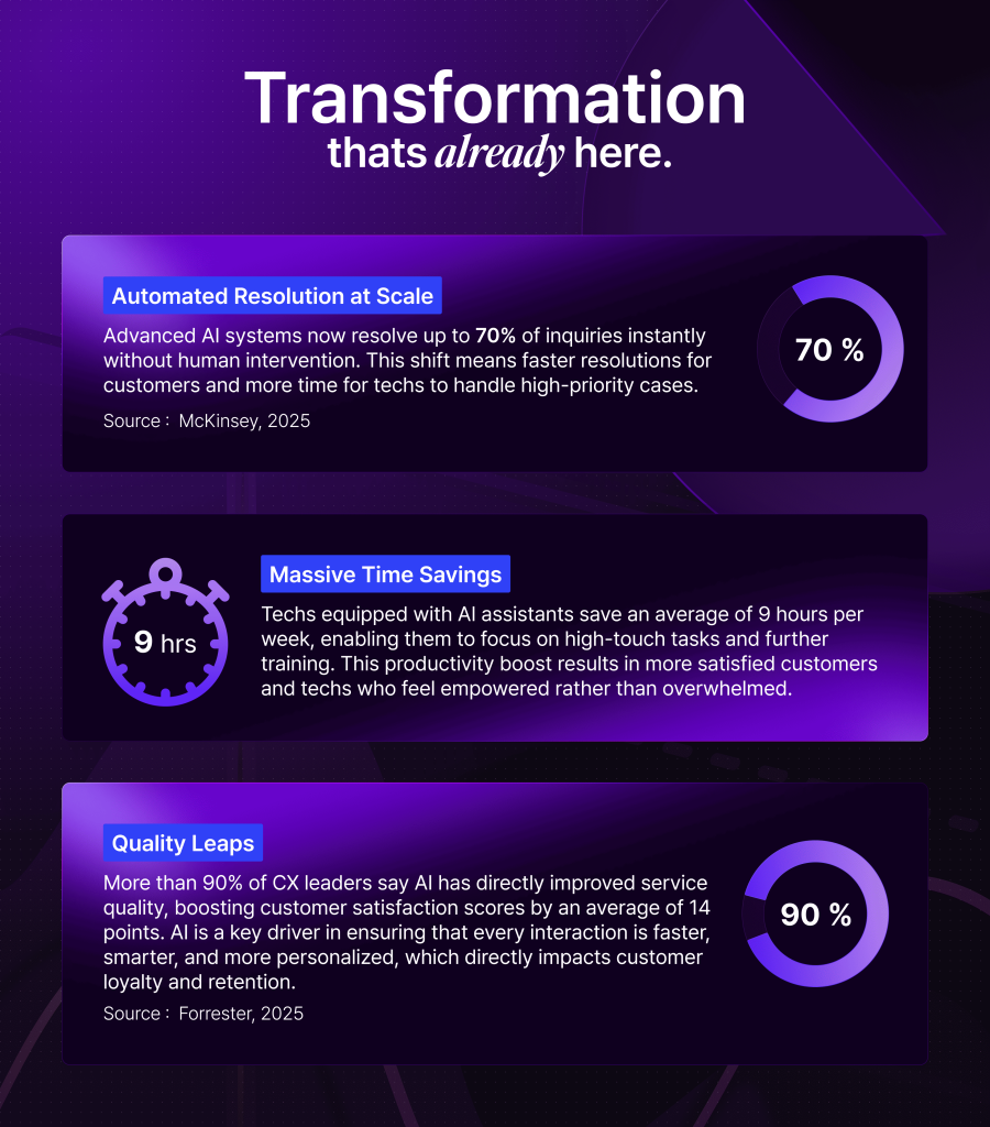 Far from replacing techs, AI is empowering them. With real-time copilots and knowledge-surfacing tools, support teams can focus on complex, emotionally charged situations. Today, 92% of techs using AI tools report increased confidence and productivity (Zendesk CX Trends, 2025). AI equips them with contextual data, so they don’t have to start from scratch with every case, allowing for faster resolutions and improved customer satisfaction.