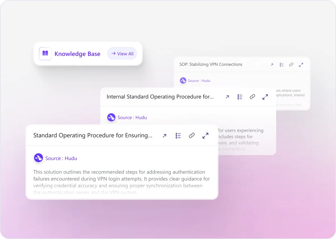 When a ticket comes in, Helena scans the summary and description, checks your connected Hudu documentation, and drops the most accurate article right into the ticket view. Your techs get answers immediately. No searching. No switching. No wasted minutes.