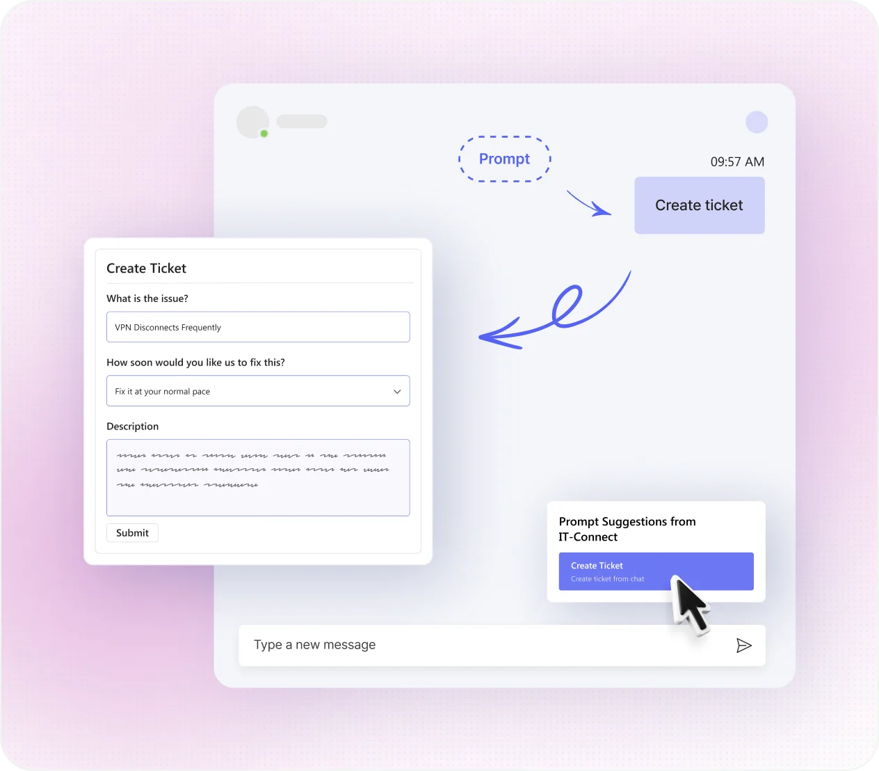 Users can raise a ticket in Teams with just three clicks—seamlessly integrated into their chat workspace.