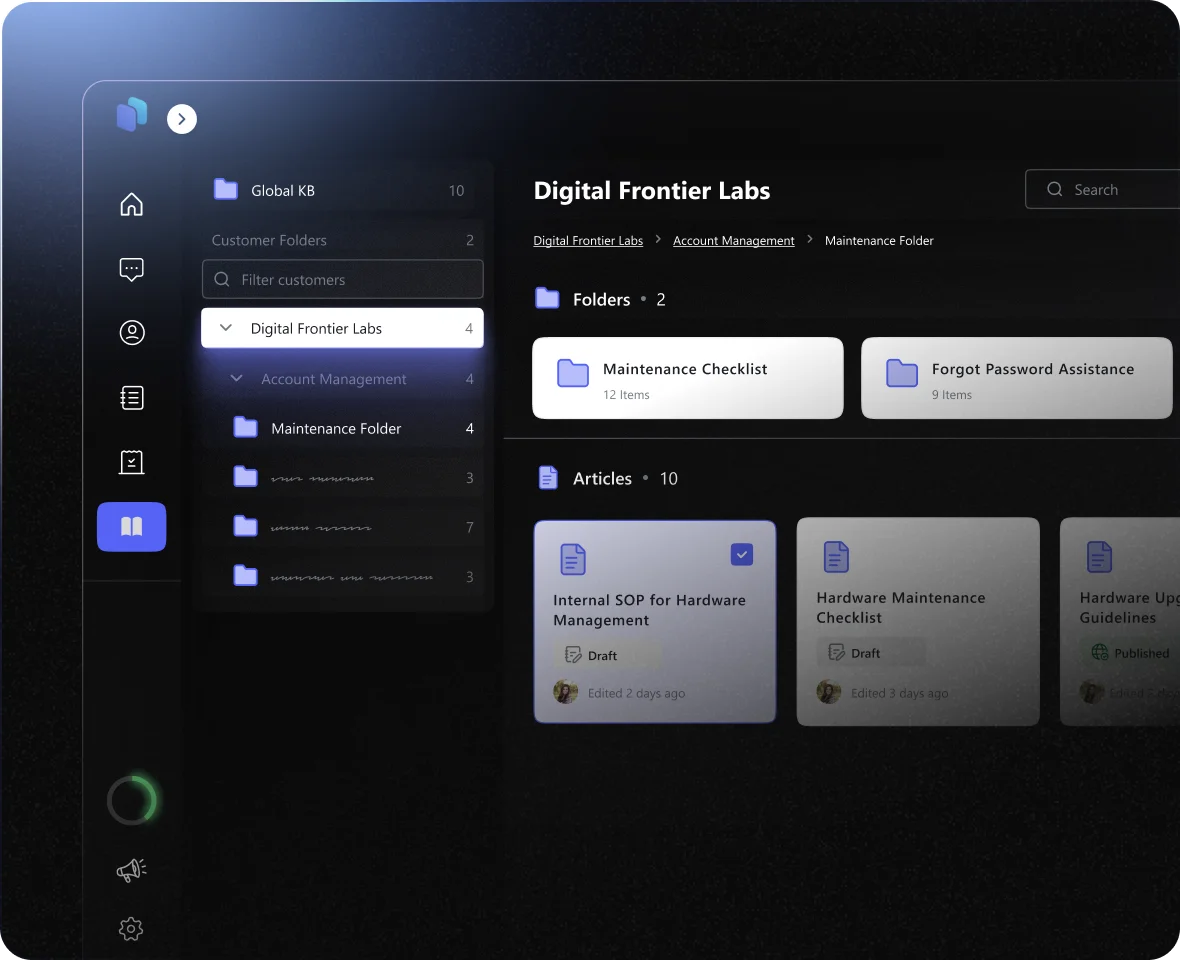 Dual-scope architecture: Global KB for universal SOPs, Customer-Specific KB for unique client documentation. Organize knowledge exactly how you manage clients.