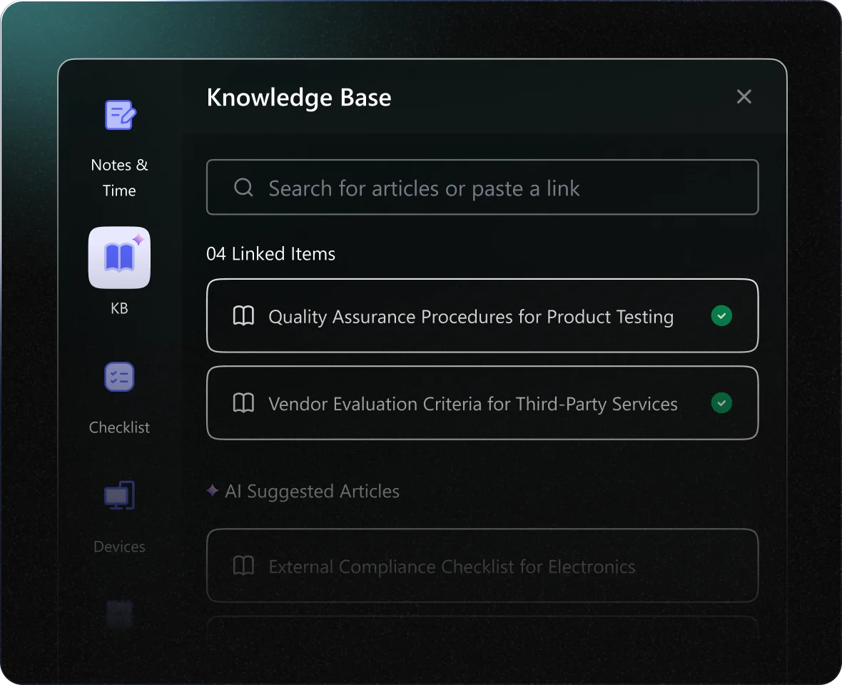 Link relevant articles directly to tickets through the integrated KB section. Knowledge becomes actionable at the exact moment your technicians need it, right inside the ticket.