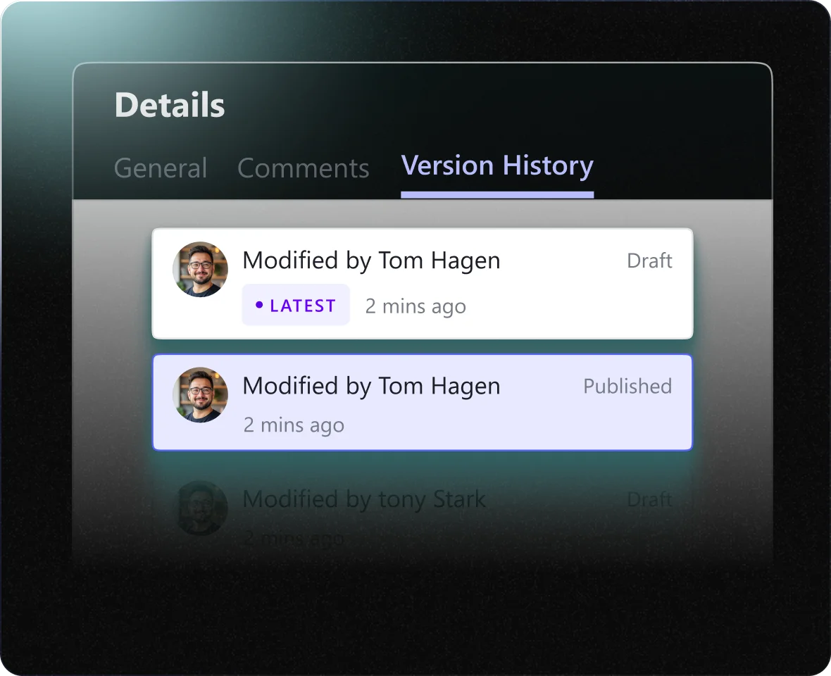Track every change with a comprehensive version history. See who made changes, when they were made, and easily restore previous versions if needed.