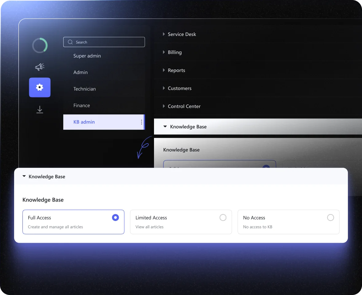 With Role-Based Access Control, admins can set permissions at the article or category level with three access tiers, View, Edit, or No Access. This ensures sensitive documentation, like client-specific procedures or internal policies, is only visible to authorized techs.