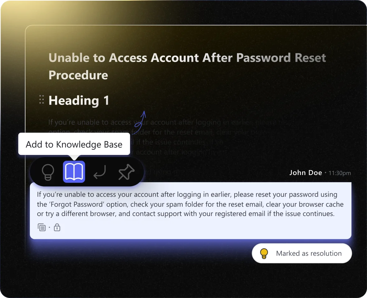 Zero friction. Create articles in 2 minutes while resolving tickets. Convert chat messages or resolution notes directly into KB articles with one click, no rewriting, no copy-paste.