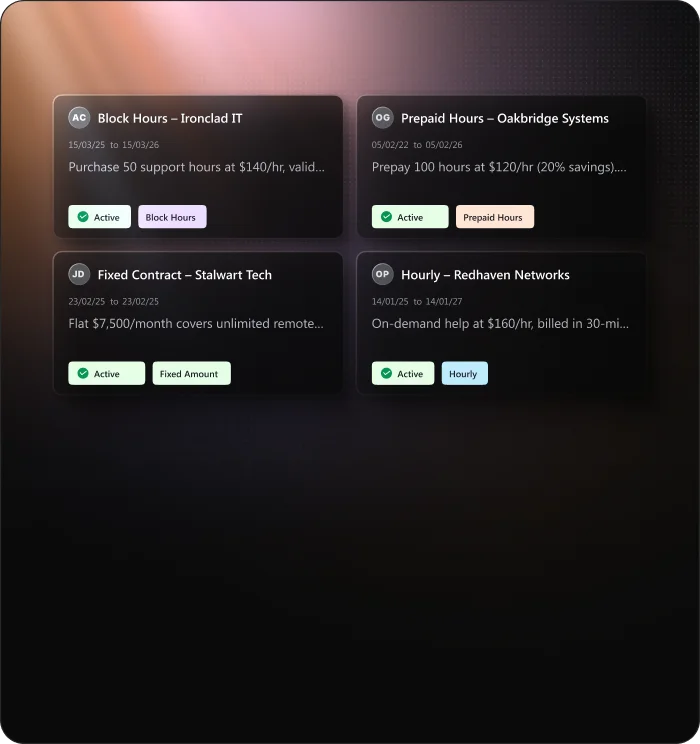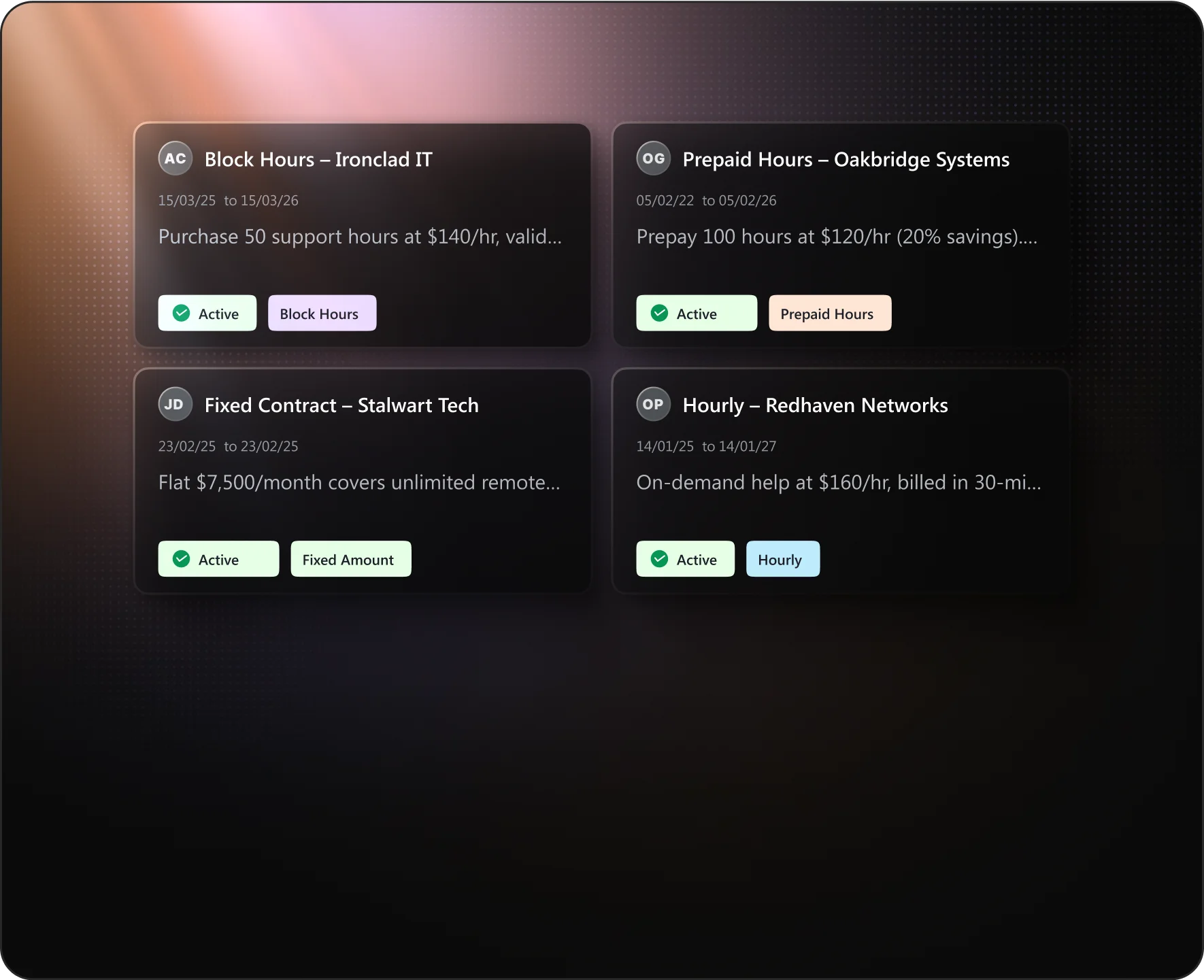 Move beyond time-tracking hassles with flexible contract options: hourly, fixed, block, and pre-paid. Choose the contract type that works best for you, and eliminate the stress of manual timekeeping.