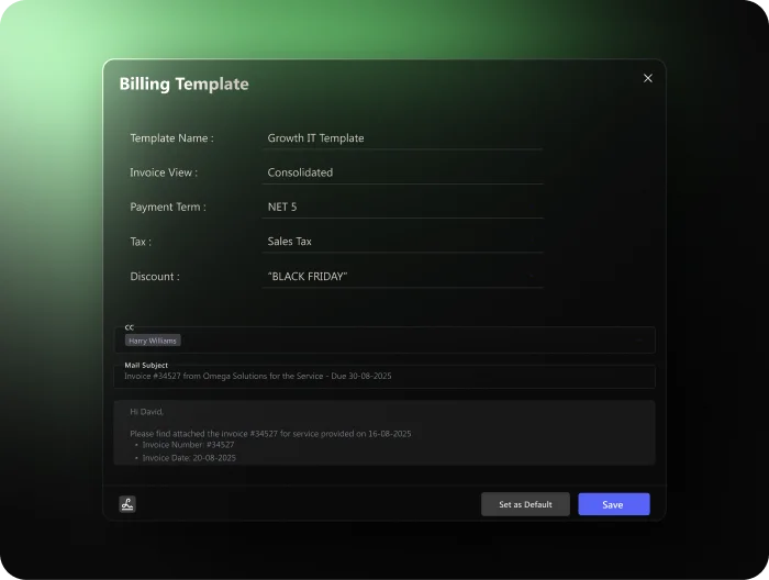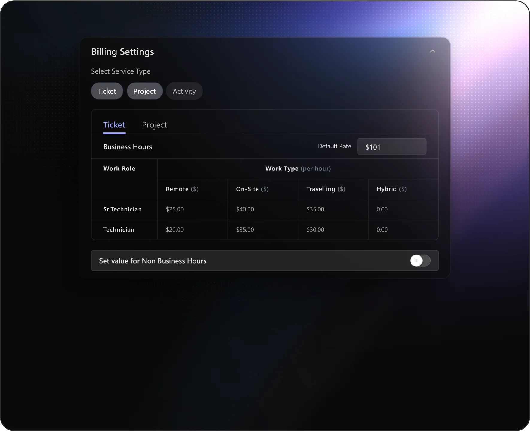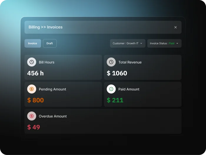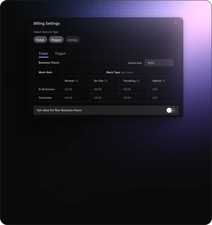 Access all billable items: time entries, activities, products, and expenses, within tickets and tasks. Streamline your invoicing process with everything in one place.