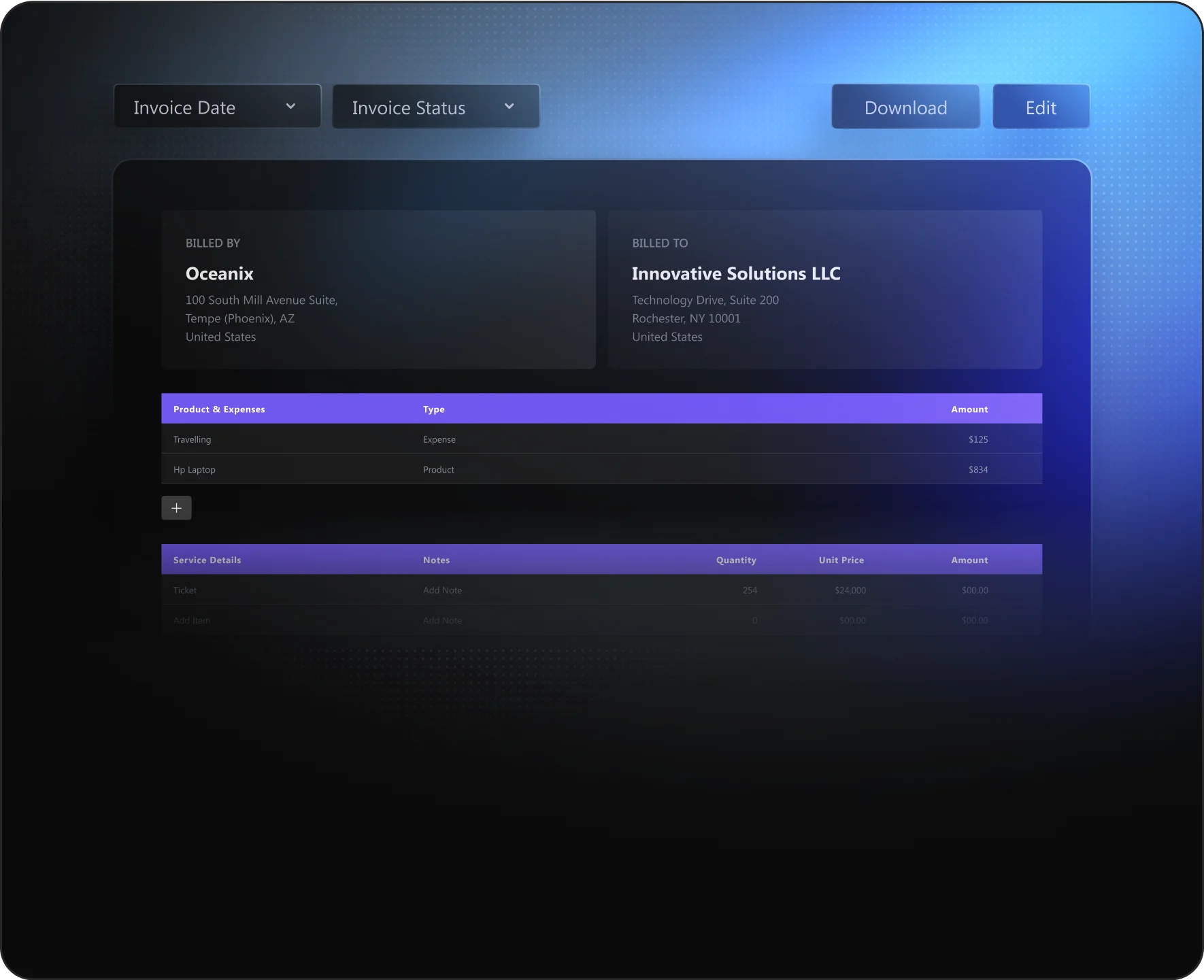 Navigate a streamlined, intuitive interface. Preview invoices before generating them, and make real-time edits to ensure accuracy. No more mistakes reaching your clients.