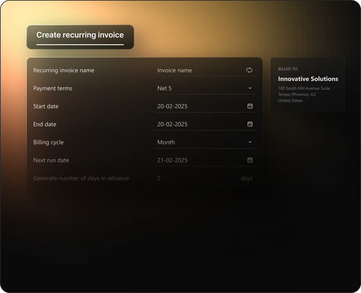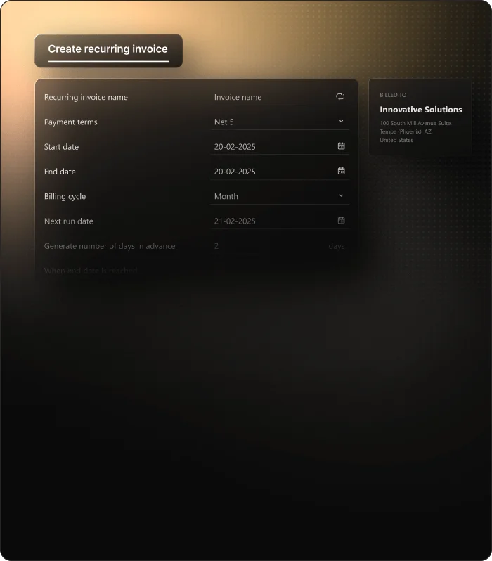 Create reusable invoice templates to standardize billing for recurring charges. Define line items, taxes, and formatting once, then apply them consistently across contracts and recurring invoices. Perfect for keeping billing clean, predictable, and error-free at scale