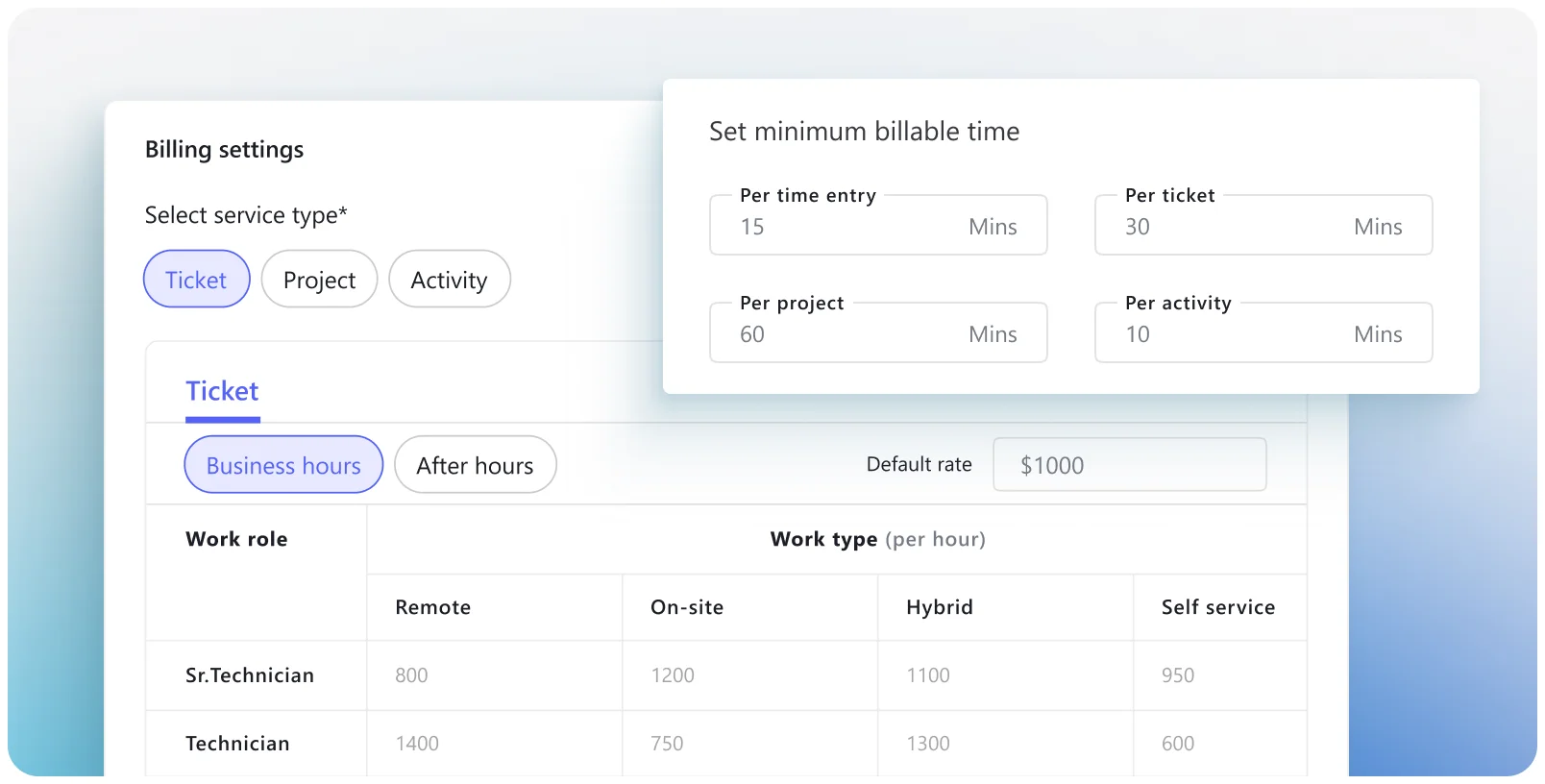 Bill only for the time that’s actually worked. Tech time logged on tickets flows straight into invoices at predefined hourly rates, with controls over minimum bill time, rounding, approvals, and custom rates per work type and work role. Well-suited for ad-hoc support, reactive work, and customers who prefer clear, pay-as-you-go billing with no surprises.