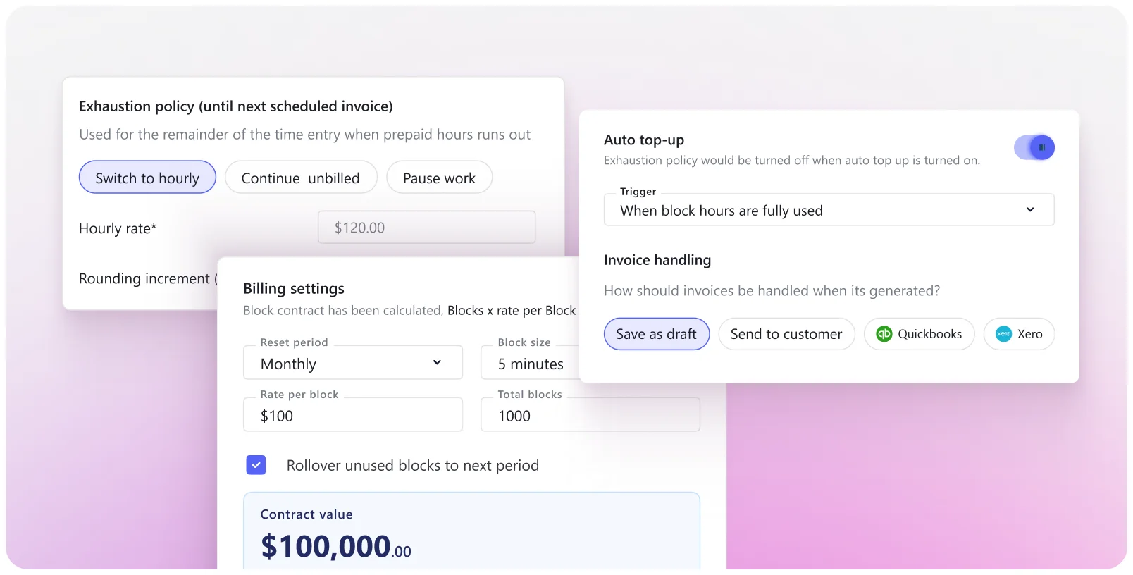 Package time into fixed blocks rather than open-ended hours. Track block consumption in real time, get alerted as limits approach, and define exactly what happens when a block is exhausted: switch to hourly billing, pause work, auto-renew, or handle billing manually. A good fit for teams that want clean math, clear boundaries, and predictable renewals without micromanaging time.