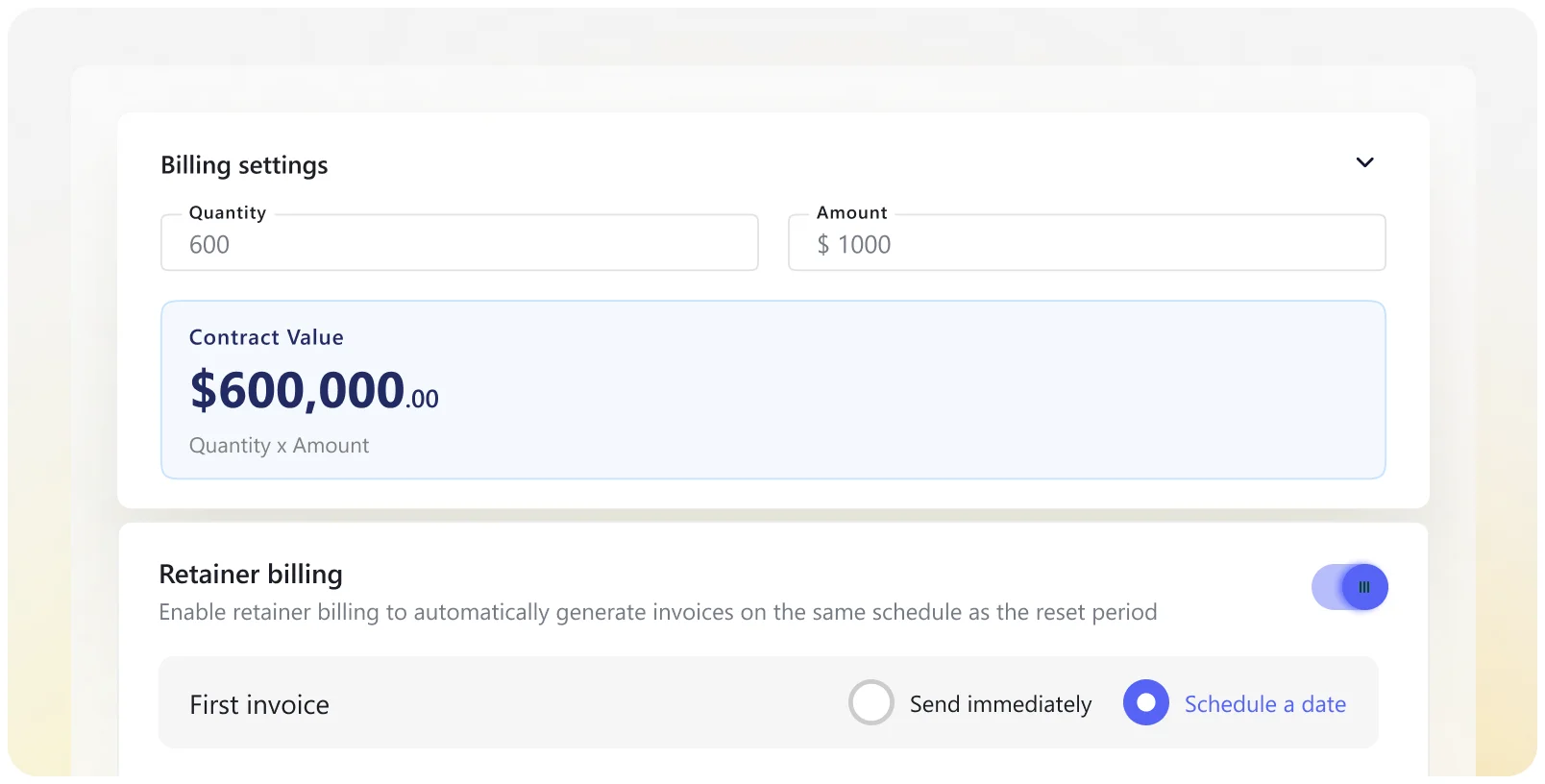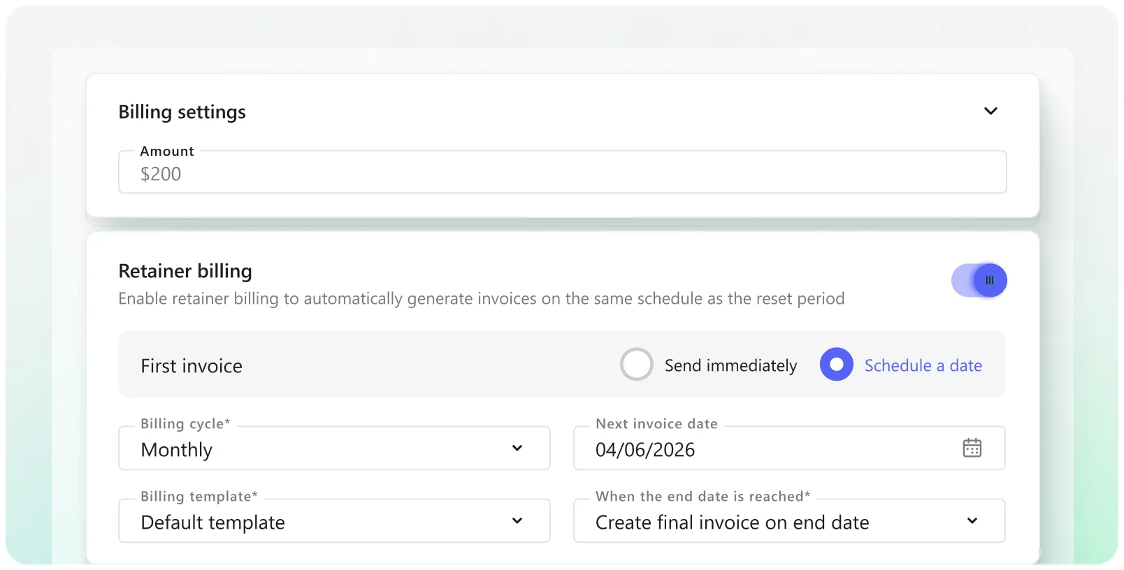 Recurring invoices are driven by retainers or recurring contracts. You can schedule invoices, save them as drafts, send them automatically, or sync them to your accounting system.