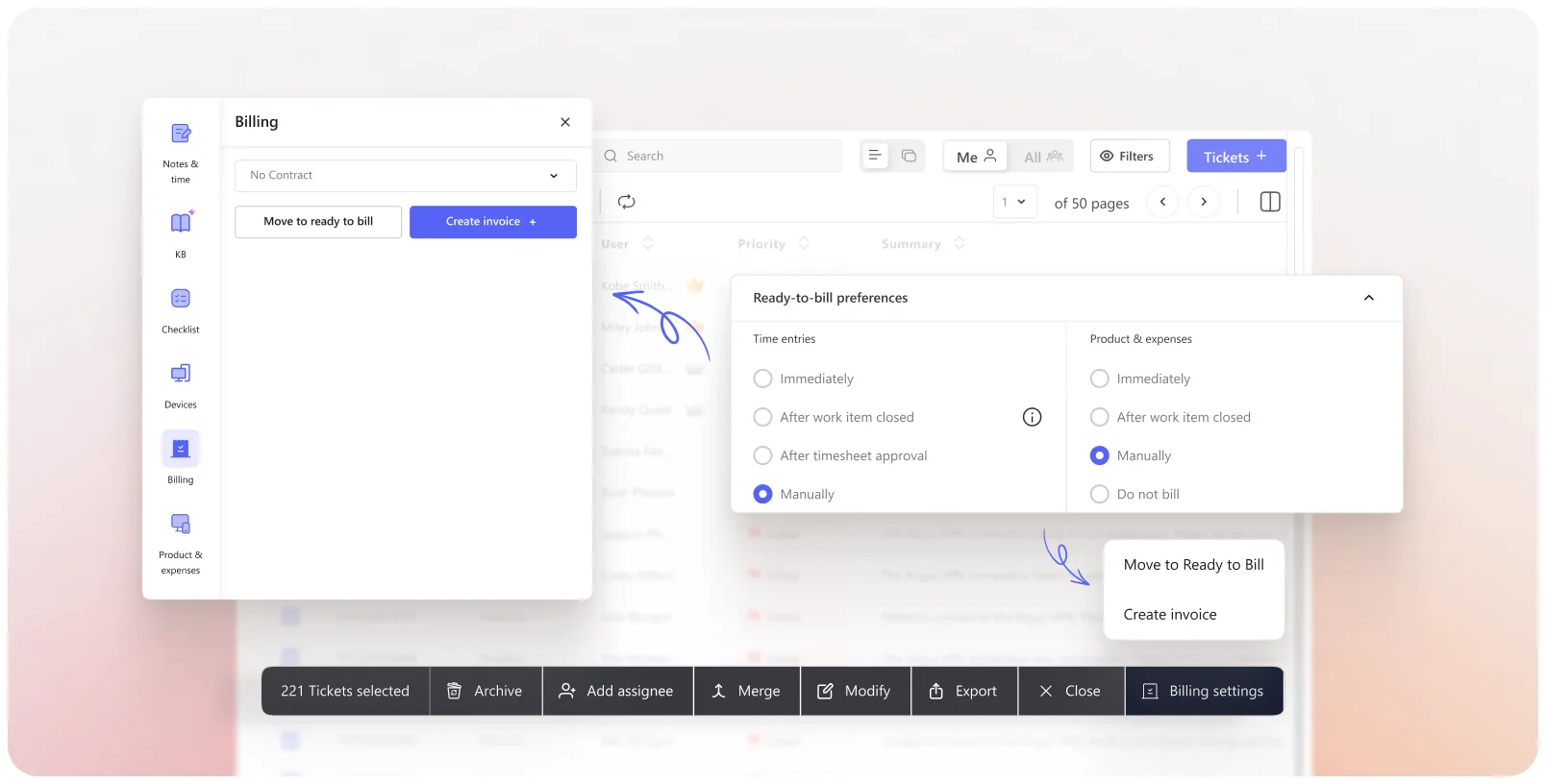 Turn completed tickets into revenue without friction. Time entries, products, and expenses flow directly from tickets to Ready-to-Bill, so nothing gets missed. Review, approve, and invoice faster, without spreadsheets, rework, or guesswork.