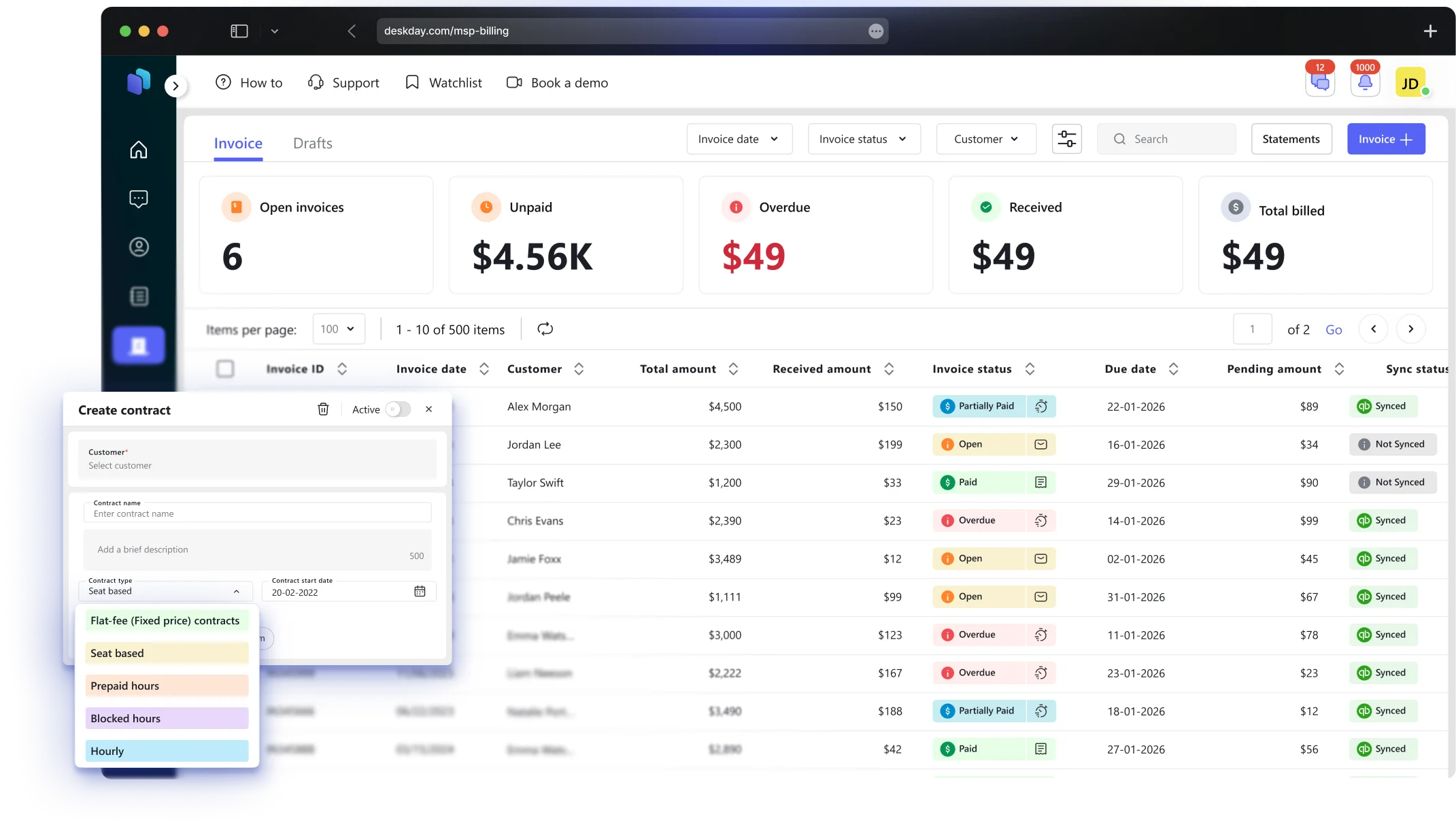 DeskDay supports hourly, prepaid hour, block hour, flat-fee, and seat-based contracts. You can mix these models across customers and even within the same customer, depending on the service being delivered.