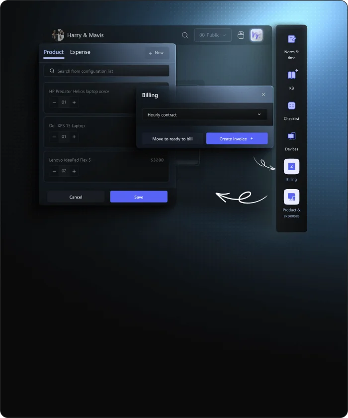 Sell a fixed number of hours upfront for a defined period and let techs work against that balance. Hours are deducted in real time, with clear visibility into what’s used and what’s left. Set alerts as limits approach, roll unused hours forward if needed, and decide what happens when the balance runs out: switch to overage rates, pause billing, or track time for manual billing later.