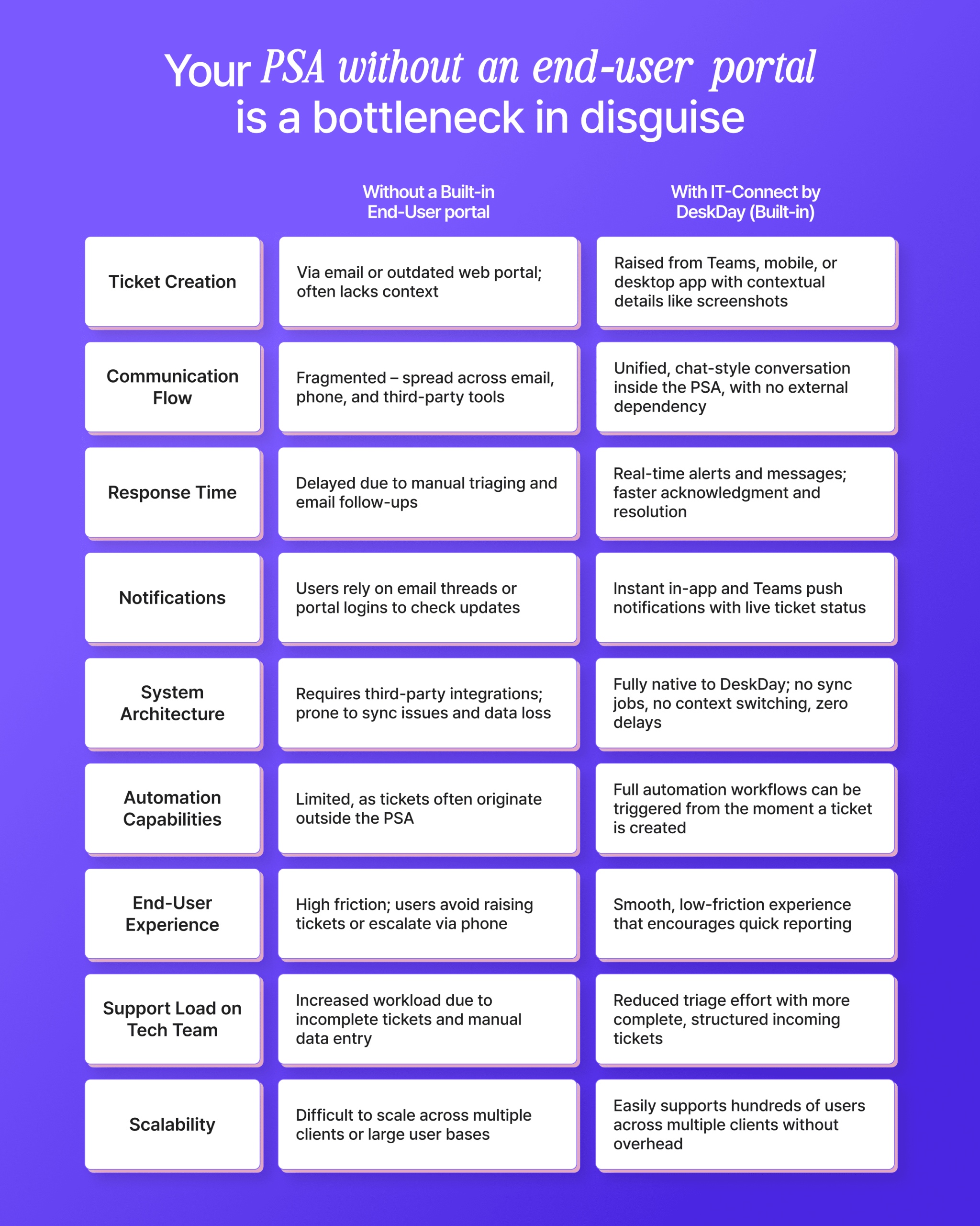 Unlike third-party chat tools or bolt-on end-user portals that require APIs, sync jobs, or middleware to communicate with your PSA, IT-Connect is natively embedded within DeskDay.