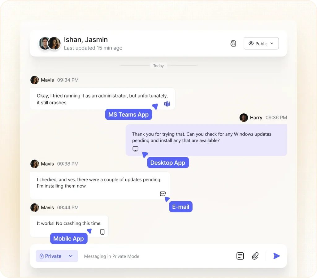 Instead of scattering conversations across chat, email, and web forms, they’re flowing all interactions into a single ticket thread, no matter where they start. Whether a user reaches out from Teams, mobile, desktop, or a support portal, the entire conversation is stitched together with clear source attribution.